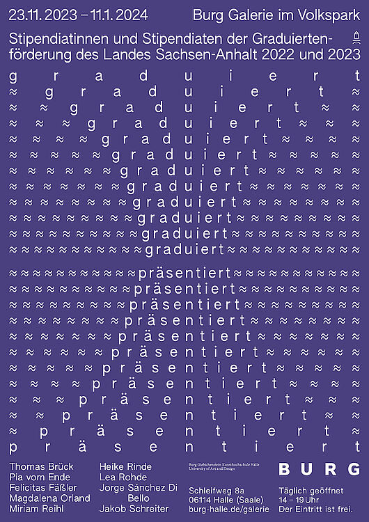 Die Ausstellenden Thomas Brück (Absolvent Zeitbasierte Künste), Pia vom Ende (Absolventin Malerei), Felicitas Fäßler (Absolventin Bild Raum Objekt Glas), Magdalena Orland (Absolventin Conceptual Textile Design), Miriam Reihl (Absolventin Interior Architecture),Heike Rinde (Absolventin Buchkunst), Lea Rohde (Absolventin Schmuck), Jorge Sanchez Di Bello (Absolvent Bild Raum Objekt Glas) und Jakob Schreiter (Absolvent Bild Raum Objekt Glas) erhielten durch die Burg Giebichenstein Kunsthochschule Halle im Rahmen des Graduiertenförderprogramms des Landes Sachsen-Anhalt für den künstlerischen und wissenschaftlichen Nachwuchs eine finanzielle Unterstützung. So konnten sie während dieses Zeitraums im Austausch mit der Hochschule ihr Forschungsvorhaben und damit einen neuen Werkkomplex entwickeln. Die abschließende Ausstellung ist ein wichtiger Baustein der umfangreichen und in den letzten Jahren stetig intensivierten Absolvent*innenförderung an der BURG.