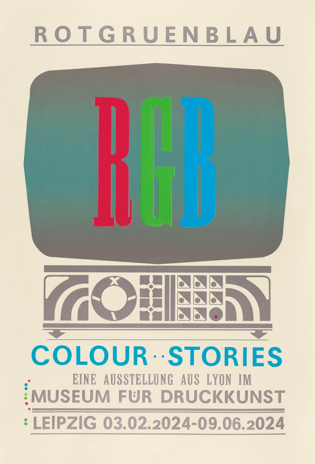 Drei Farben, drei Geschichten. Das Museum für Druckkunst Leipzig zeigt die Ausstellung RGB – Rot Grün Blau. Colour Stories, eine vom Musée de l’Imprimerie et de la Communication graphique in Lyon entwickelte Schau zur Mediengeschichte der drei Lichtfarben. Die Ausstellung taucht ein in den Farbraum der Bildschirme, in dem jedes Bild aus einer Mischung von Rot, Grün und Blau entsteht. In über sechzig Objekten – Gemälden, Druckgrafiken, Fotografien, Filmen, Spielen, Reklame, Büchern – wird den vielfältigen Anwendungsweisen, Wirkungen und symbolischen Bedeutungen dieser drei Farben nachgespürt.