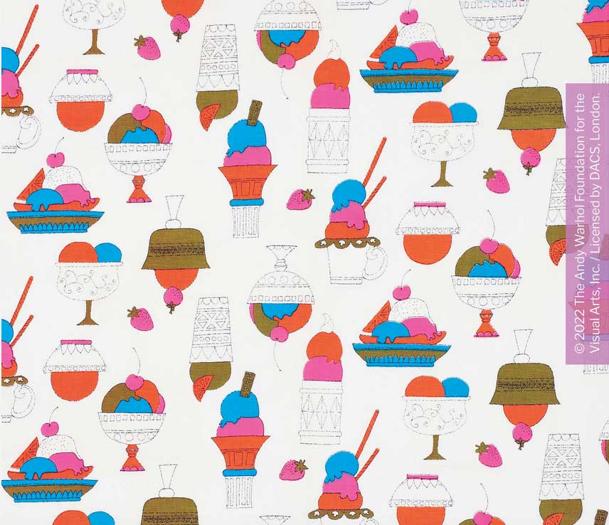 Die Ausstellung umfasst mehr als 45 von Warhols Textilmustern aus den 1950er und frühen 1960er Jahren, die eine Reihe bunter Objekte zeigen – Eisbecher, köstliche Toffee-Äpfel, bunte Knöpfe, aufgeschnittene Zitronen, Brezeln und hüpfende Clowns, die sowohl als Stoffbahnen, einige in mehreren Farben, als auch als Kleidungsstücke ausgestellt sind. Auch einige der wichtigsten Hersteller der amerikanischen Textilgeschichte sind vertreten, wie Stehli Silks, Fuller Fabrics Inc. und M Lowenstein and Sons. (Pressetext a.d. Englischen)