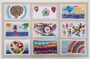 Ein Modul besteht aus einem mit Trägerstoff bespannten Keilrahmen mit den Maßen: 64 cm B x 41cm H im Querformat. In der Vielfalt der Stickarbeiten kann so ein eindrucksvolles künstlerisches „Bild der Hoffnung“ vermittelt werden.“ (Angelika Schlüter)