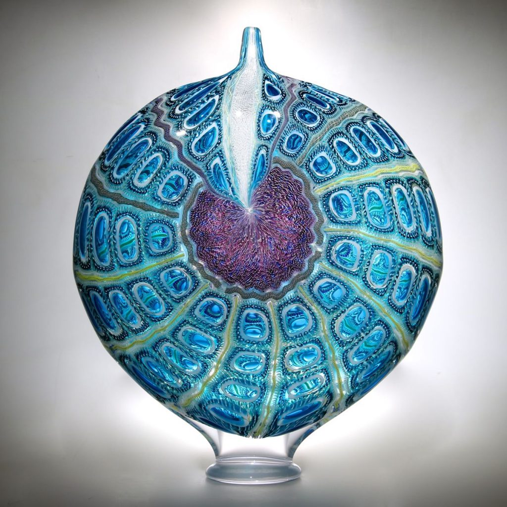 Das künstlerische Schaffen von David Patchen hat uns ebenfalls sehr überzeugt. Der Glaskünstler arbeitet mit traditionellen Murrine- und Cane-Techniken, die er u.a. bei großen Meistern in Murano erlernt hat. Mit großer Experimentierfreude, akribischer Handwerkskunst und Liebe zum Detail interpretiert er sie jedoch auf seine eigene Weise. So schafft er farbenfrohe, hochkomplexe Skulpturen, an deren Muster man sich einfach nicht sattsehen kann. Eine davon ist „Aqua Glow Eclipse“, die von uralten, versteinerten Korallen und ihren erstaunlich lebendigen organischen Formen inspiriert wurde.