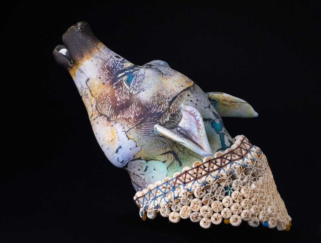 „Siku (Dire Wolf)“, ein kraftvoll gefertigter Wolfskopf, handgeformt und graviert mit starken Oberflächenstrukturen von Shelley Muzylowski Allen, zählt dazu. Die Künstlerin ist im Norden Kanadas aufgewachsen, und so wundert es nicht, dass sich in ihrer Arbeit wiederkehrende Themen wie Mythen, Natur und Tiere ihrer Heimat widerspiegeln: „Indem ich diese Geschöpfe in Zuständen der Anmut, Ruhe oder Bewegung darstelle, hoffe ich, ihre innewohnende Natur einzufangen. Mein Hintergrund als Malerin und mein Verständnis der Anatomie bilden die Grundlage, von der aus ich zu impressionistischeren oder auch kontemplativen Ausdrucksformen übergehe.“