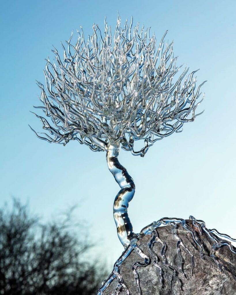 Mit einem Förderpreis wurde Wanja Sturhan für seine Arbeit „Der Baum“ ausgezeichnet. Meisterhaft gelingt dem jungen Künstler hier eine poetische Symbiose zweier widersprüchlicher Materialien – Glas und Stein. Die Baumkrone mit ihren zarten und dichten Ästen ragt auf einem knorzigen Stamm empor, dessen Wurzelwerk sich mit dem Felsen verbindet. Glas und Stein können gegensätzlicher nicht sein, doch Wanja Sturhan überwindet diesen Widerspruch dank seines Talentes und Gespürs für das Lampenglas.(Pressetext)