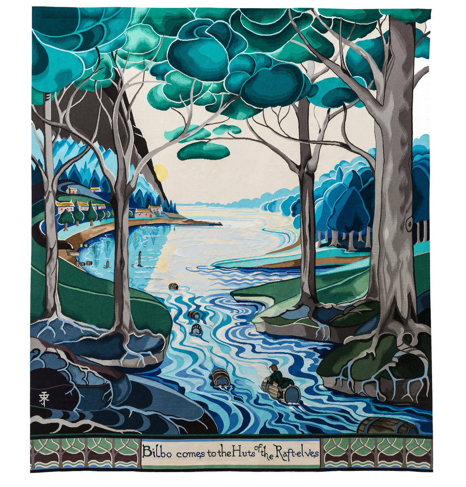 Bilbo comes to the Huts of the Raft-Elves, d’après l’œuvre originale de J.R.R. Tolkien, © The Tolkien Estate Limited 1937, tapisserie, tissage Atelier A2 et François Vernaudon, Aubusson, 2018, Collection Cité internationale