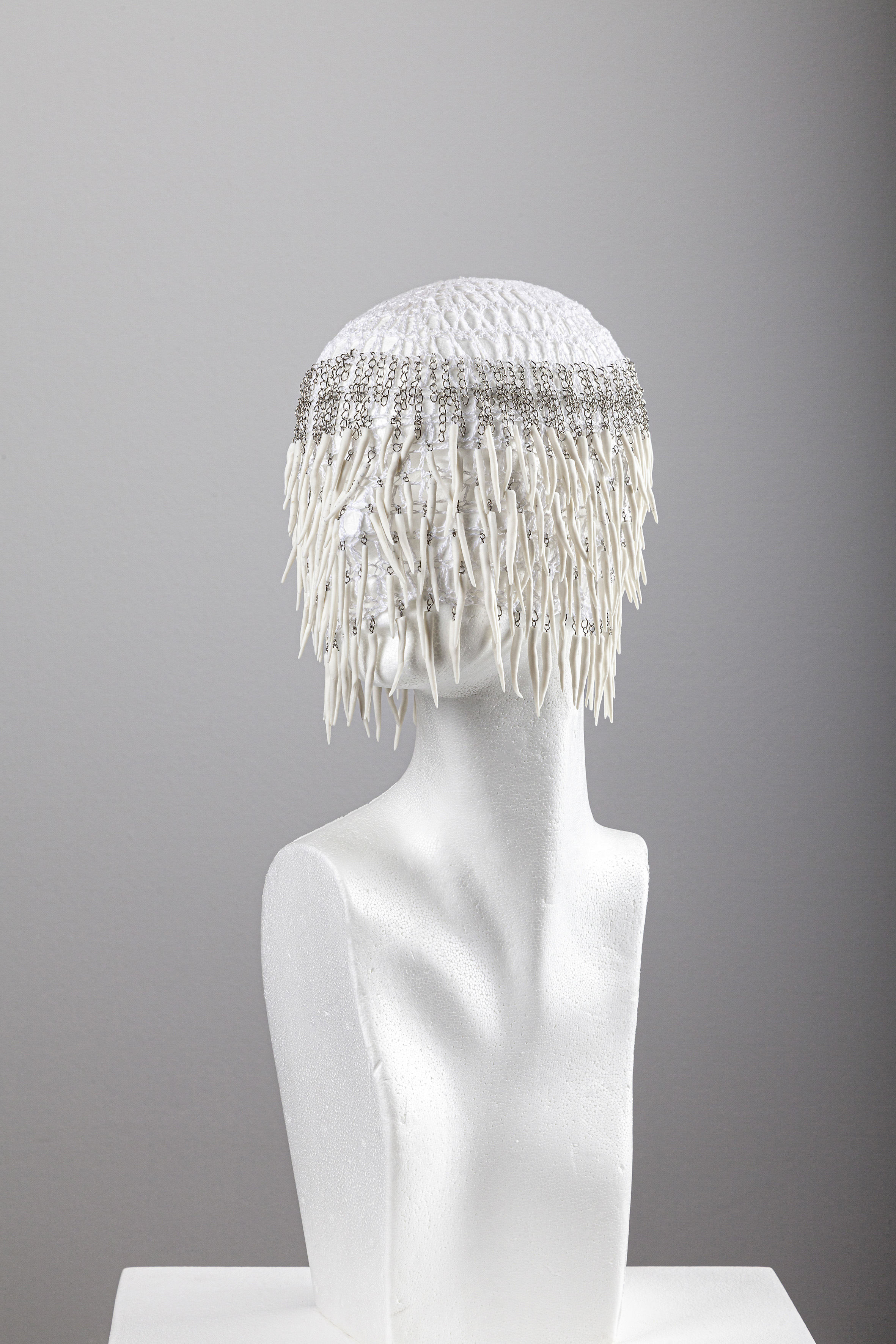 Neben der Ausführung hat die Jury auch die kreative, nicht konventionelle Auseinandersetzung mit dem vorgegebenen Thema überzeugt. Obwohl die Kopfbedeckung das ganze Gesicht bedeckt, lässt es die Strukturen des Gesichts erahnen und spricht durch die akustische Komponente – einem sanften Klirren der „Porzellan-Stacheln“ – mehrere Sinne an, schafft beim Aufsetzen sogar eine eigene Erlebniswelt. Das macht die Arbeit von Edith Berger zu einem würdigen ersten Sieger im Wettbewerb „Gut behütet – Kopfbedeckungen neu gedacht“ 2025.
