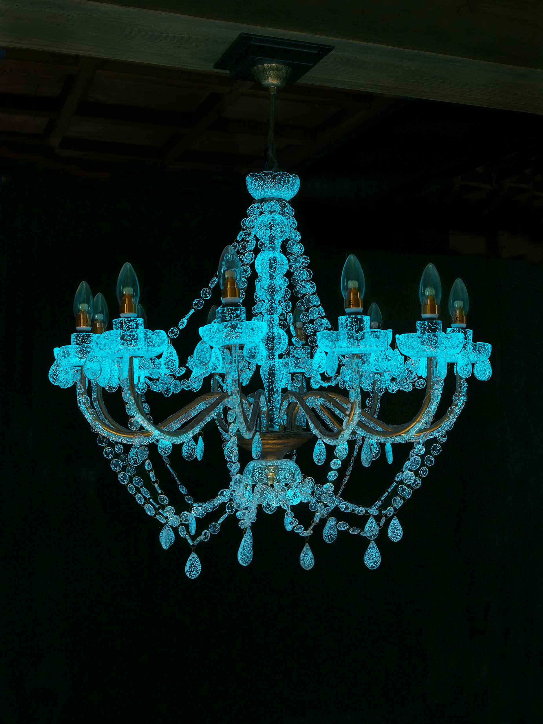 „One Second of Silence“ spannt einen weiten Bogen in seiner Untersuchung des Lichts und seiner Interaktion mit Glas – von Laserlicht und vibrierenden Spiegeln bis hin zu schimmernden intelligenten Glasfenstern, vier Meter breiten Gemälden und einem Kronleuchter, der durch das wechselnde Wetter in Toyama, Japan inspiriert wurde.
