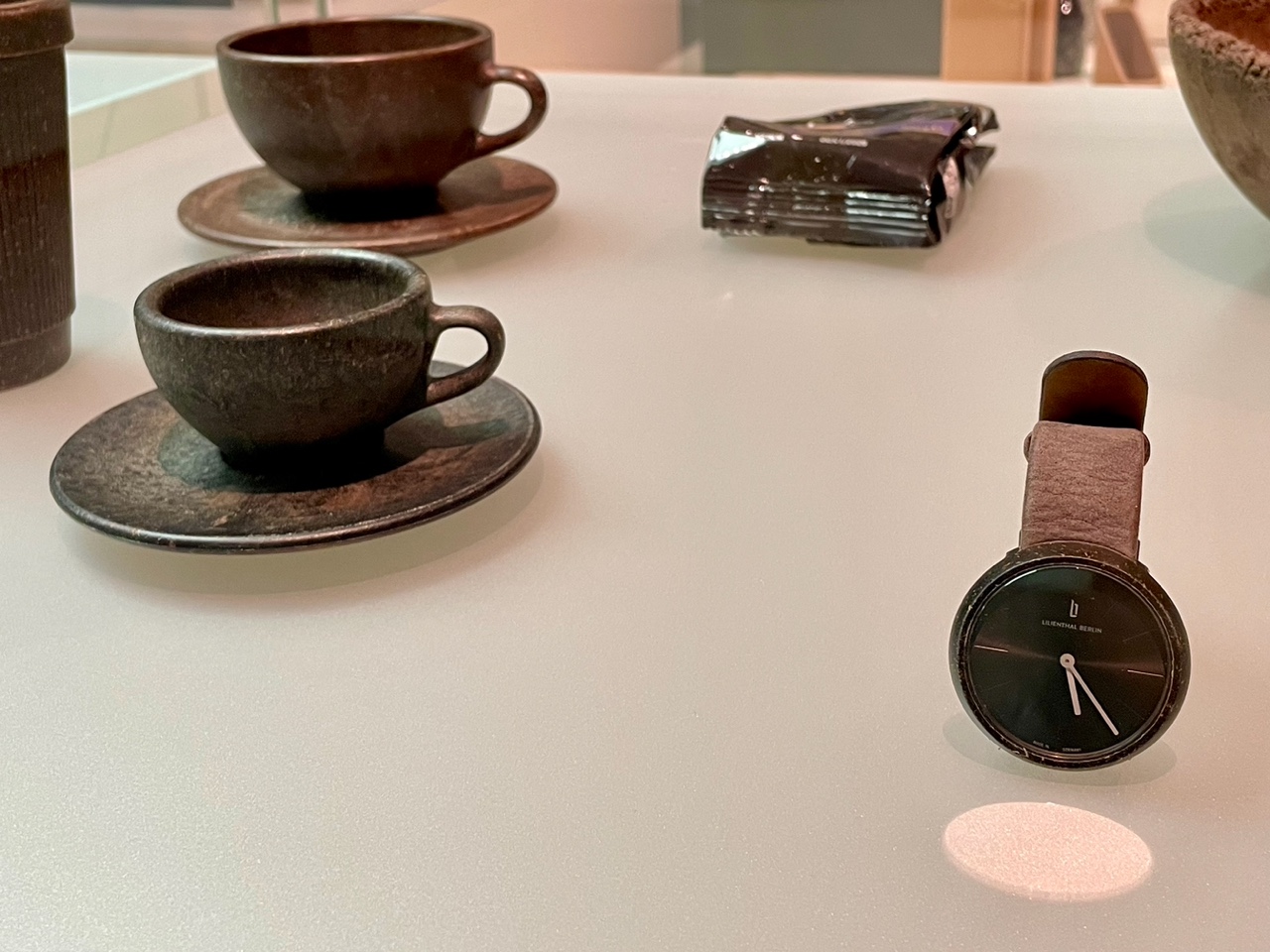 Die Abteilung „Ready-Made-Future/ gebrauchsfertige Zukunft“ überrascht die Besucher im zweiten Teil der Ausstellung. So viele geniale, gut durchdachte Materialien und Produkte gibt es schon heute auf dem Markt, die Ergebnisse einer schon existierenden Kreislaufwirtschaft sind, sich aber in der Industrie und in unser aller Bewusstsein als Konsumenten noch nicht ausreichend durchsetzen konnten. Mit maßgeblicher Unterstützung von Prof. Dr. Sascha Peters und Diana Drewes von Haute Innovation, Berlin, einer Zukunftsagentur für Material und Technologie, wurden im Themenkomplex der Biomaterialien Designinnovationen zusammengestellt, die auf natürliche Rohstoffe zurückgehen und nach Möglichkeit biozirkulär sind. In dieser Präsentation begegnet uns der schon oben erwähnte Kaffeesatz in einer Uhr des Berliner Designers Julian Lechner, deren Gehäuse aus innovativem Coffee-Material ist. Sie verzichtet auf alles Überflüssige und regt dazu an, den eigenen Umgang mit Ressourcen – und mit der Zeit – bewusster wahrzunehmen.