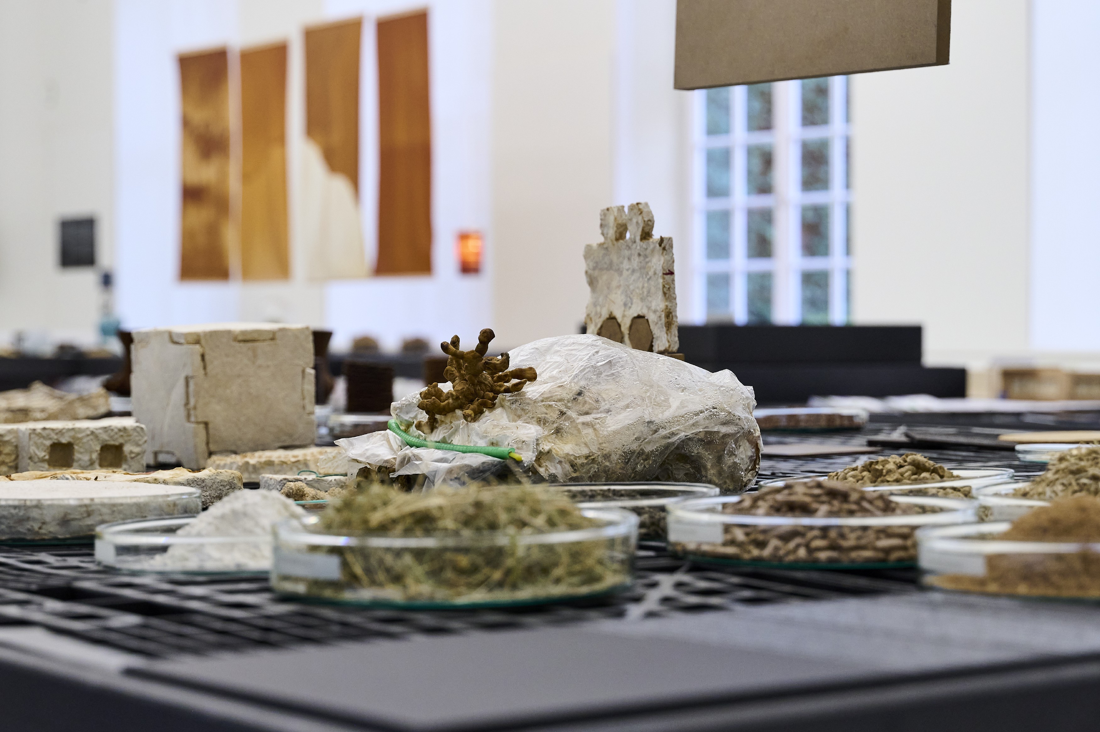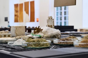 Als Material Lab/ Material Labor beschreiben sie den dritten Teil der Ausstellung in der Orangerie. Hier offenbaren vier Hochschulen und ein niederländisches Designstudio in rund 40 Projekten, die sich an den Schnittstellen von Biologie, Design, Kunst und Industrie bewegen, die Prozesse hinter ihren aktuellen Forschungen. Auch wenn sich die Aufgabenstellungen hin und wieder ähneln sind die Ergebnisse oft sehr unterschiedlich – doch letztlich hängt alles miteinander zusammen. Spätestens hier, angesichts der Fülle an Forschungsprojekten, die ja nur eine winzige Auswahl aus dem globalen Forschungskosmos abbilden, kann sich eine optimistische Vision auf die globale Zukunft entzünden.