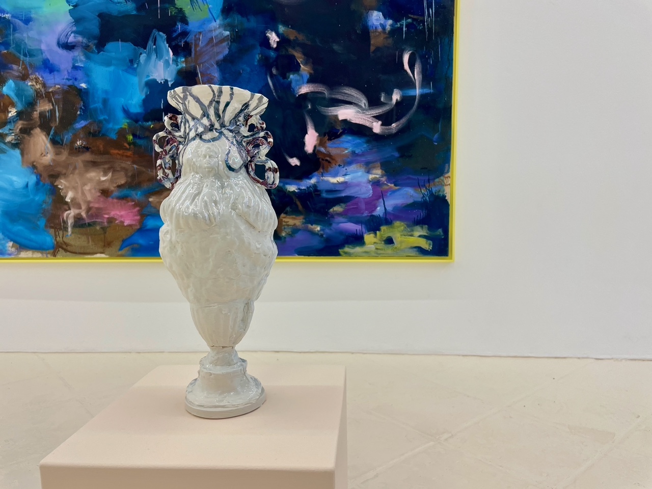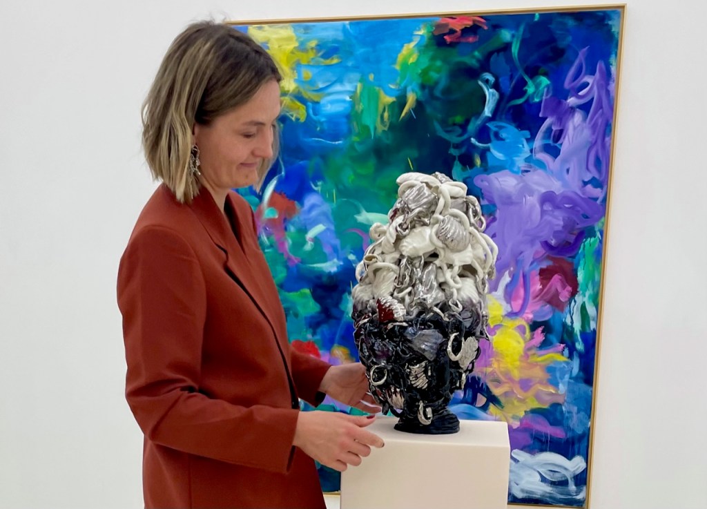 Im Dialog stehen Sarah’s lebendigen und spannungsreichen Vasenskulpturen zu den ebenso lebendigen und spannungsreichen Malereien der Leipziger Künstlerin Winnie Seifert. Die Zwiesprache der Künstlerinnen ist erfrischend und über die Maßen spektakulär. Vasen, die keine sind, stehen im Austausch mit Blumen, die keine sind. Mit üppigem, geradezu lustvoll ausgreifendem Gestus schicken die beiden Künstlerinnen ihr Material, ihre Farbe auf den Laufsteg – als großartige, formale Abstraktionen ihrer Inspirationsquellen. Atmosphärisch ein Meisterwerk!