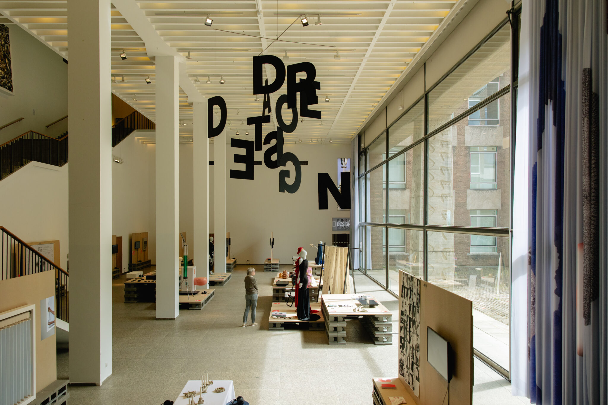 Das Ausstellungsdesign, konzipiert und umgesetzt vom Kölner Studio für Gestaltung, setzt auf lokal ausgeliehene Materialien aus der Baubranche, um Materialeinsatz und CO₂-Ausstoß auf ein Minimum zu reduzieren. Unterstützer: Druckerei Kettler, Berberich Papier, Fassbender Tenten Baustoffhandel.