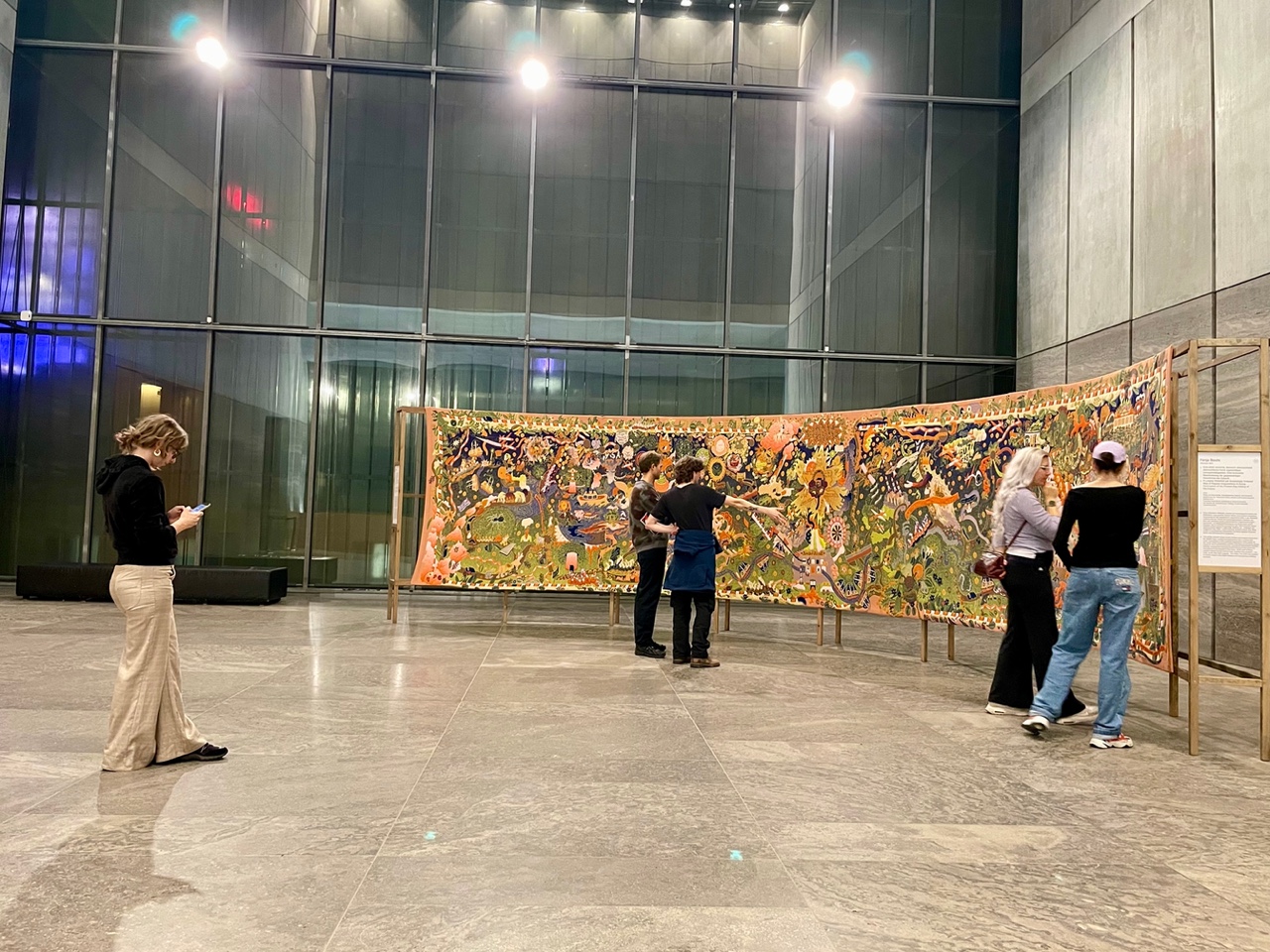 Mit einer Auswahl von rund 50 Bildteppichen führt die Ausstellung die erstaunliche ästhetische Bandbreite dieser Welt aus Fäden vor Augen, gibt Einblicke in die historische Entwicklung des Mediums und fragt nach seiner künstlerischen Aktualität. Die Leihgaben umfassen traditionelle barocke Tapisserien ebenso wie Werke nach Vorlagen renommierter Künstler*innen der Avantgarden – der klassischen Moderne – des 20. Jahrhunderts. Vertreten sind auch bedeutende Produktionen der Nachkriegsmoderne bis hin zu internationalen Positionen der Gegenwart, in denen die Künstler*innen als Autor*innen dann auch selbst Regie im textilen Herstellungsprozess führen – unter Ihnen z.B. Fern Liberty Kallenbach Campbell, deren Werk für die Fortführung der Tradition des Gobelinhandwerks an der Burg Giebichenstein in Halle steht. Der Ausstellungsparcours führt durch alle vier Museumsgeschosse des MdbK. Dabei bildet die großzügige Architektur des Hauses mit ihren Terrassen und weiten Durchblicken den wirkungsvollen Bezugsrahmen für die monumentalen Wandbehänge.