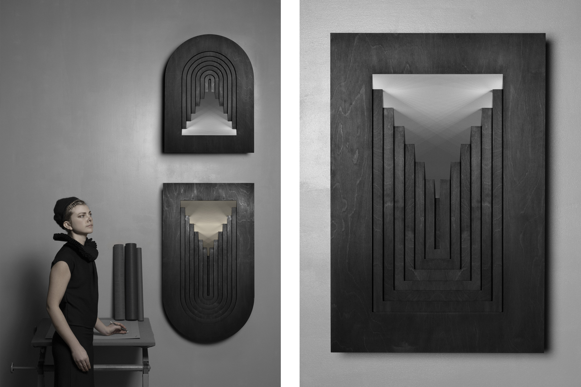 In dieser Serie übersetzt Siba Sahabi die lineare Perspektive in dreidimensionale Formen und kombiniere sie mit dynamischen Arabesken-Schatten. Verborgene Lichtquellen beleben die Skulpturen, während die architektonischen Strukturen unbeweglich bleiben. Durch das geometrische Design werden die visuellen Aspekte der Mathematik sowohl in der linearen Perspektive als auch in den Arabesken in zeitgenössische Kunstwerke übersetzt. (Pressetext)