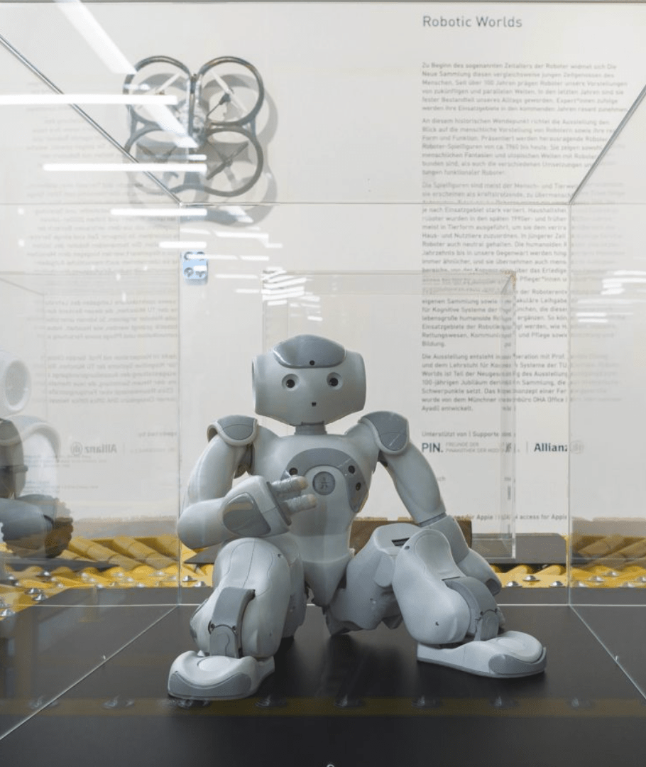 Ein neuer Raum in der Neuen Sammlung. Zu Beginn des sogenannten Zeitalters der Roboter widmet sie sich diesen vergleichsweise jungen Zeitgenossen des Menschen. Seit über 100 Jahren prägen Roboter unsere Vorstellungen von zukünftigen und parallelen Welten. In den letzten Jahren sind sie fester Bestandteil unseres Alltags geworden. Expert*innen zufolge werden ihre Einsatzgebiete in den kommenden Jahren rasant zunehmen.
