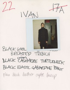 Helmut Lang, Show Fitting Polaroid auf Papier mit handschriftlichen Look Beschreibungen, Helmut Lang Collection Hommes Femmes Séance de Travail Défilé # Hiver 01/02 (2001). Abgebildete Person: Iván de Pineda.