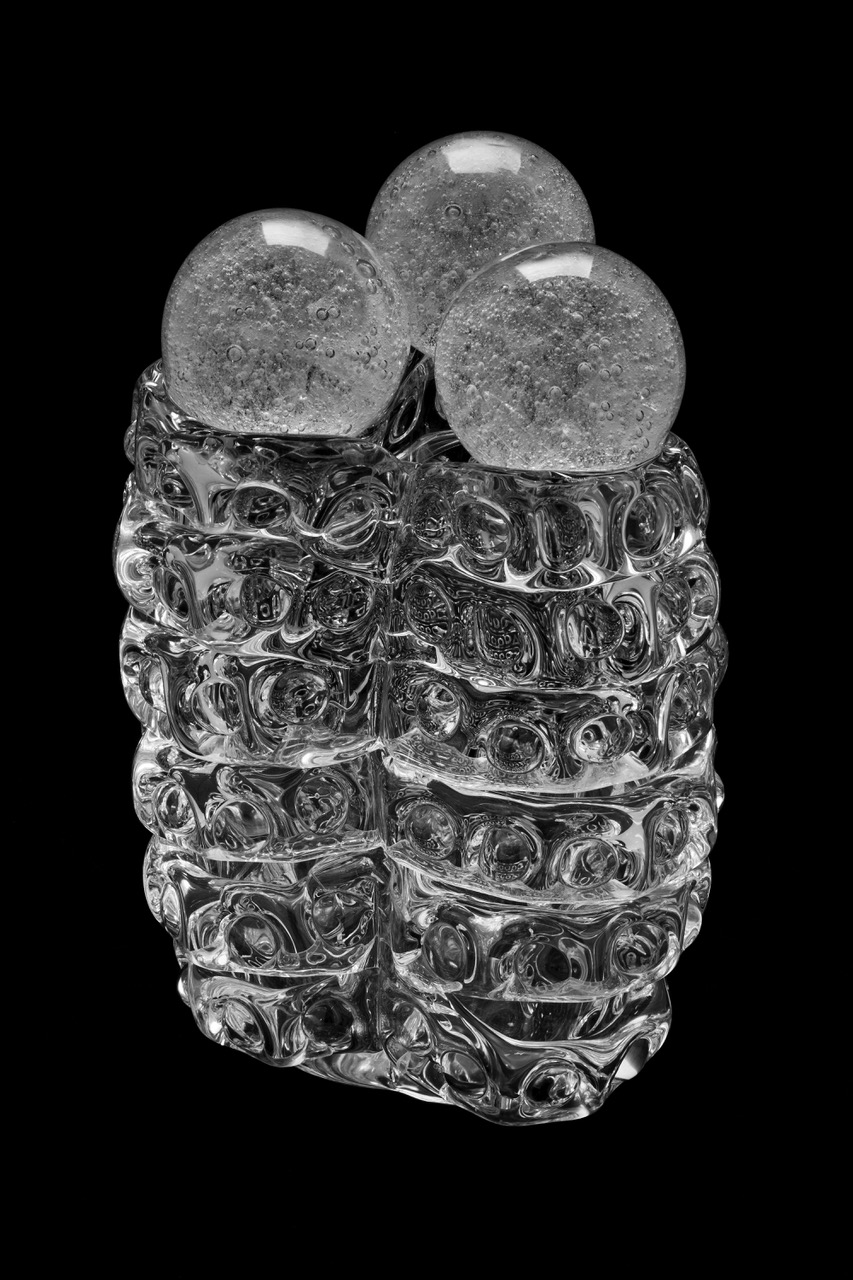 Es erfordert viel Mühe, die eigenwilligen venezianischen Glasbläsermeister dazu zu bringen, mit samuraihafter Disziplin und japanischem Minimalismus zu arbeiten. Ritsue Mishima schwingt in diesen geschichtsträchtigen Werkstätten buchstäblich den Taktstock und bringt sie dazu, ihre Zeichnungen als kristalline Skulpturen zu verwirklichen, massiv und doch filigran, die das Licht einzufangen scheinen. Fantasien der Lagune werden lebendig, achromatisch und damit noch poetischer – eine Reminiszenz an die Pracht der Ursprünge des klaren Glases von Murano im elften Jahrhundert. (Pressetext)