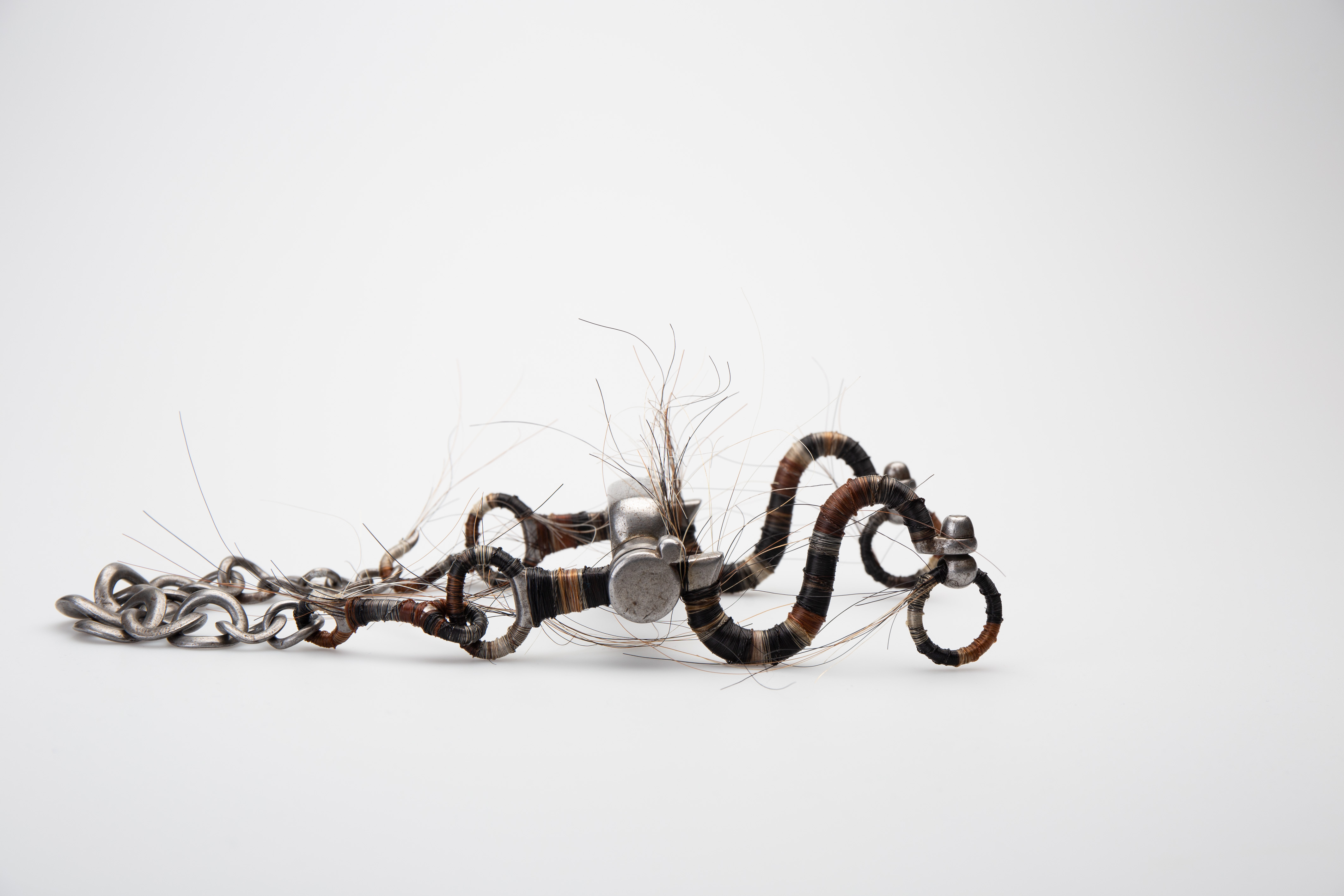 Die Ausstellung „Spuren legen. Mit Materialität erzählen“ präsentiert neun Künstler*innen, die Material als Träger von Botschaften verstehen. Indem sie Materialien ihren gewohnten Kontexten entziehen, machen sie sichtbar, in welchem Verhältnis diese zum Menschen stehen und welche gesellschaftlichen Strukturen sie spiegeln. Die Künstler*innen wenden sich dem Unscheinbarem zu, das dennoch von Bedeutung ist, machen verborgene Spuren sichtbar und zeigen, was unsere Lebenswelten prägt. Ihr Schmuck steht für Wertvorstellungen, Herkunft oder formuliert Kritik.